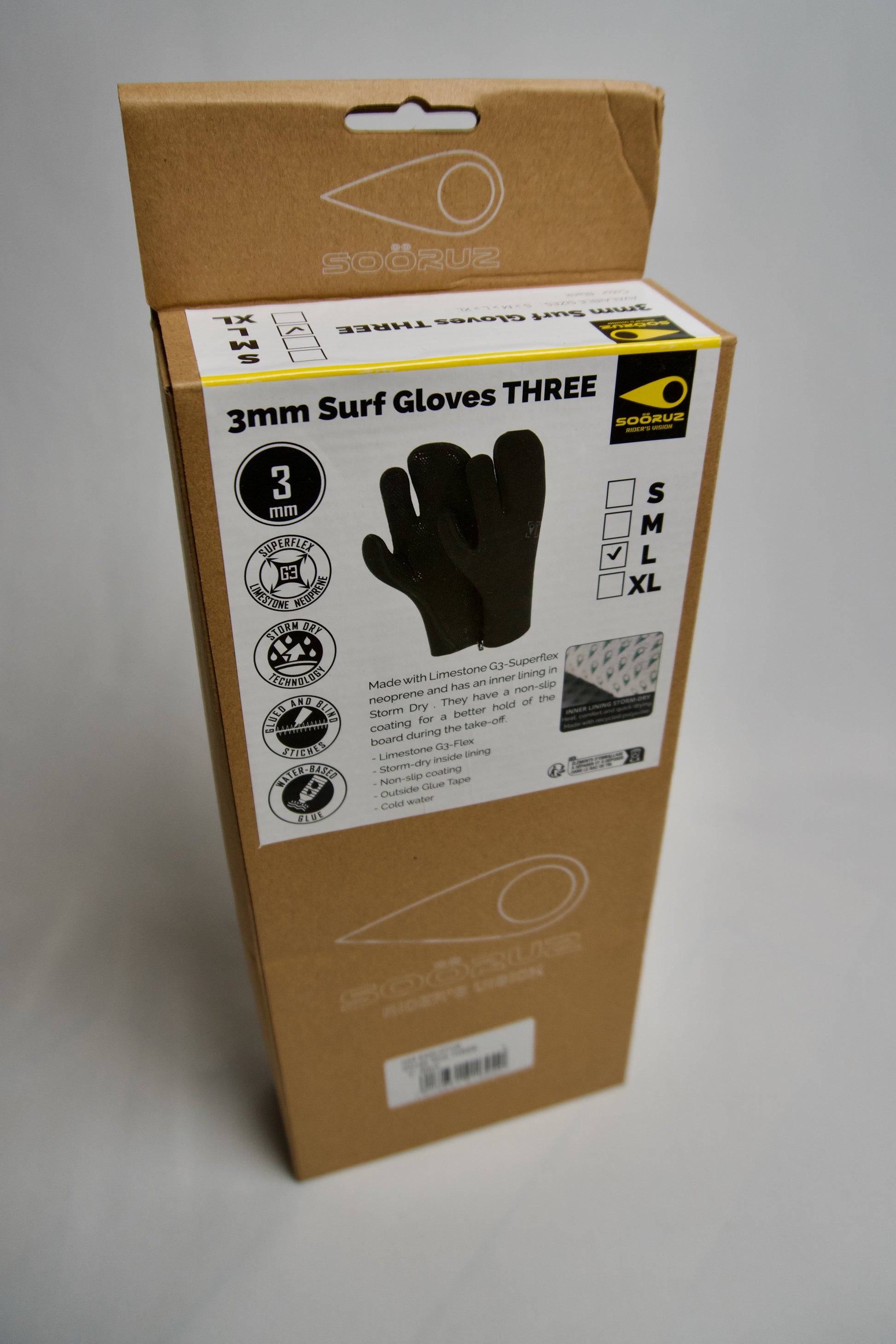 Rukavice Three jak už z názvu vyplývá je tříprsté konstrukce. Jde o nejvyšší řadu rukavic, které Soöruz nabízí. Materiál je pružný a neomezuje tak pohyb prstů i přes tloušťku materiálu 3mm. Jsou plně utěsněné s lepeným lemem. Vnitřek rukavice je vystlán materiálem Stormy Dry, který se postará a pohodlí, teplo a rychlé schnutí. Stormy Dry je vyroben z recyklovaného polyesteru. Vnější vrstva je voděodpudivá, což zajistí klouzání vody po povrchu a nenasákavost materiálu. Dlaň je velmi odolná proti opotřebení a má drobnou protiskluzovou strukturu.